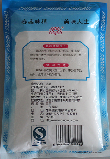 包裝規(guī)格型號(hào):(谷氨酸鈉含量80%、99%)50g、90g、100g、180g、360g、380g、400g、454g、500g、800g、908g、1kg、2kg、2.27kg、2.5 kg、25kg